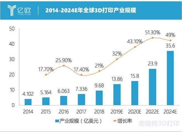 亿欧网/日前,咨询机构沃勒斯发布2019年3D打印产业年度报告:2018年的3D打印产业规模为96.8亿美金,并预测到2020年有望达到158亿美金,2022年可能会爬升至239亿美金,2024年则有可能达到356亿美金。热度爬升:投资热度不断,玩家开始增加日前,咨询机构沃勒斯发布了2019年的3D打印产业年度报告:2018年的3D打印产业